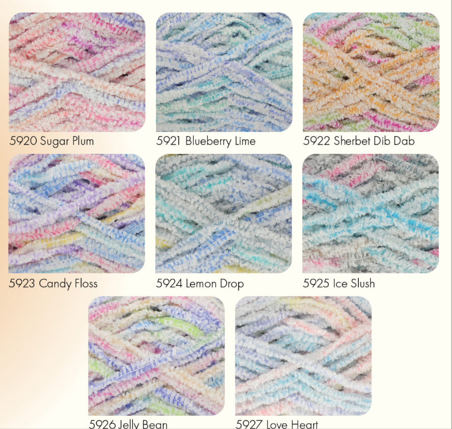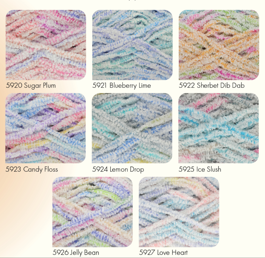 Fruitilicious, a delightfully soft, fluffy yarn, perfect for creating adorable garments for little ones! Available in eight colourways, each multicoloured, pastel ball is sure to give a gentle touch against delicate skin.