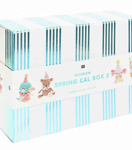 The Ricorumi Spring CAL Box III "Birthday Party" combines a diverse selection of yarns that have been specially put together for the crochet-along of the same name. With 27 balls of Ricorumi dk, three Twinkly Twinkly balls with a fine glitter effect, two Ricorumi Nilli Nilli balls with a silky sheen, two Ricorumi Neon balls for bright accents and one Lamé ball for festive details, the box offers a wide range of textures and effects. This variety allows for vibrant designs and detailed figures that are ideal for birthday themes – whether for decorative accessories, amigurumi or small gift ideas. All yarns are packed in a sturdy box that keeps the material organised and can also be used as decorative storage or as a gift for crochet enthusiasts.